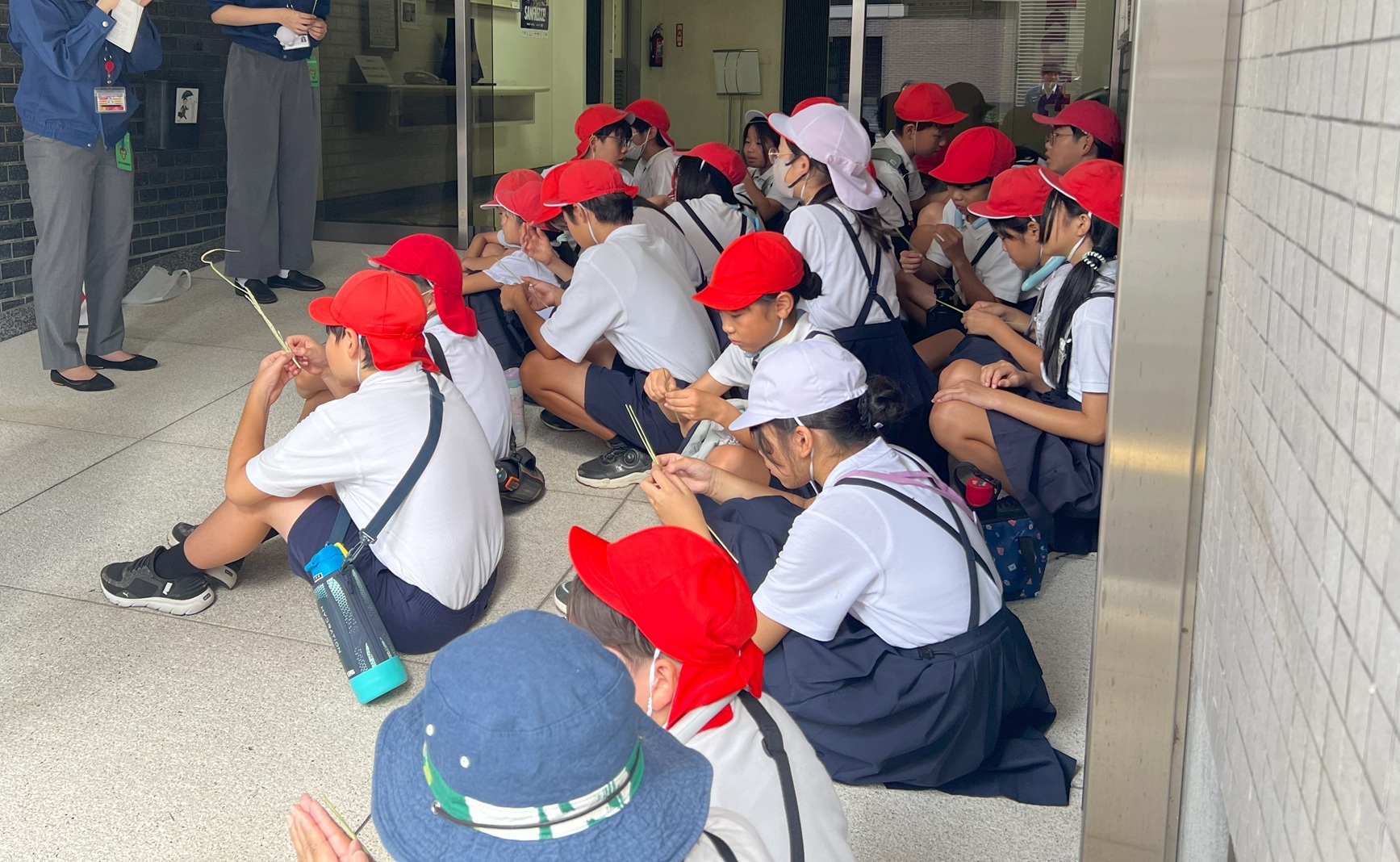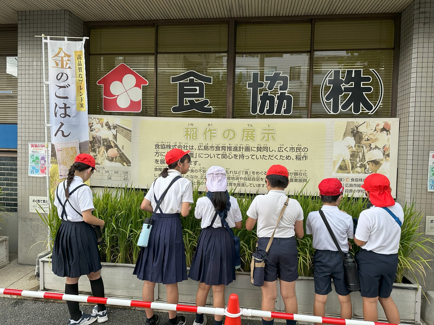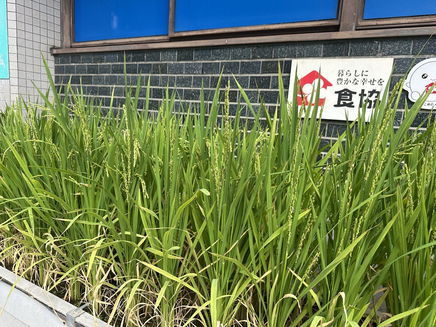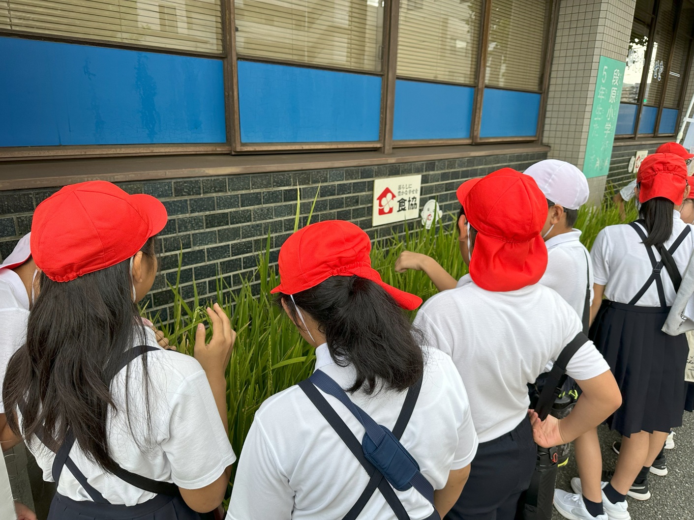 食協㈱本社の食糧会館前にて、段原小学校5年生の皆さんに、6月11日に田植え体験をしていただいた稲の経過観察を、9月上旬に行っていただきました。