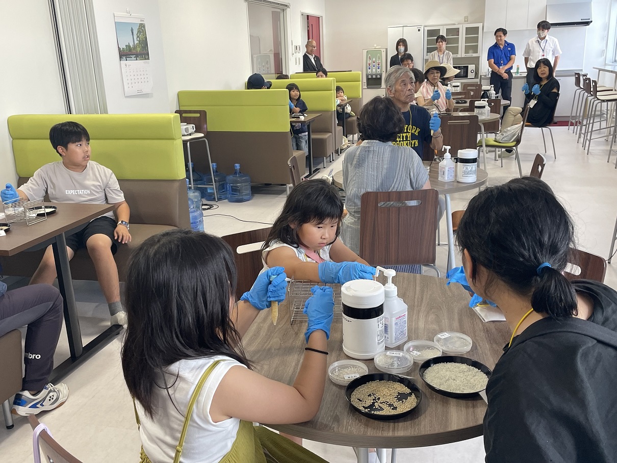 食育実験では、お米の新鮮さを調べる実験をしていただきました。